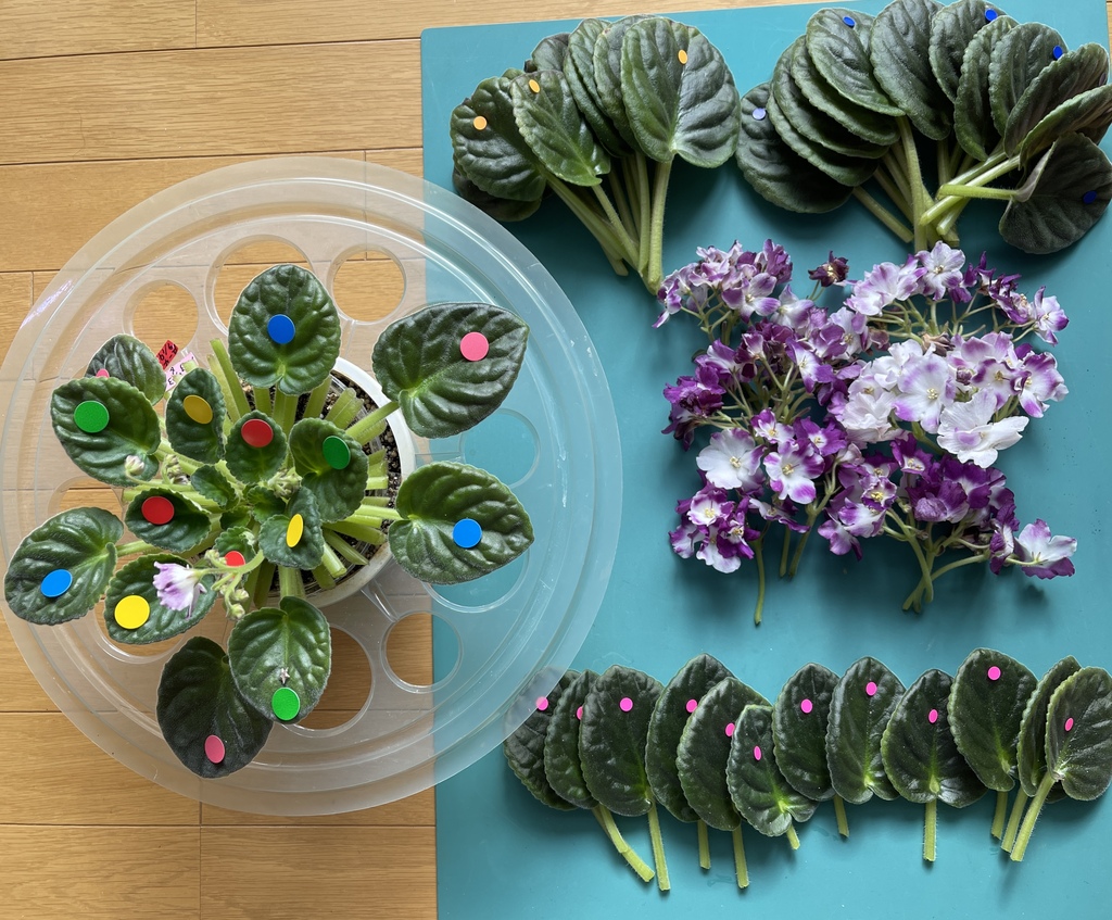 大株に育ったセントポーリアでしたが、葉について言いますと、取り除いた葉36枚+残した葉15枚+中心葉3枚=「54枚」の葉で展開していました。