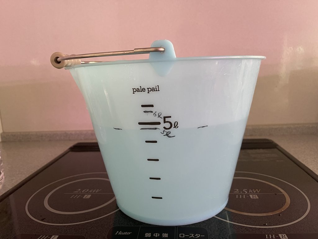 用意したバケツの目盛、念のため、計り直しをしたところやはり誤差がありました。
